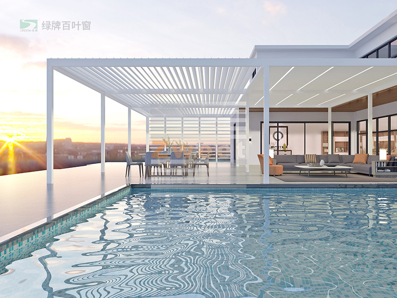 綠牌頂面遮陽防雨百葉系統(tǒng)用于露臺遮陽,設(shè)計(jì)簡約,美觀實(shí)用,通過調(diào)節(jié)頂面的百葉系統(tǒng),起到很好的遮陽防雨效果。