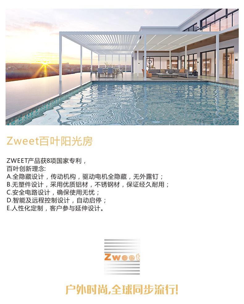 8.陽光房的四周可選擇安裝玻璃百葉窗,木制百葉窗,鋁合金百葉窗,玻璃滑動(dòng)門及垂直的玻纖遮陽卷簾,完善您的百葉房功能。