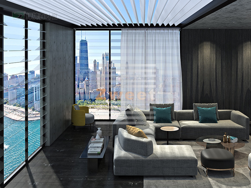 綠牌頂面遮陽(yáng)防雨百葉系統(tǒng)用于露臺(tái)遮陽(yáng),設(shè)計(jì)簡(jiǎn)約,美觀實(shí)用,通過調(diào)節(jié)頂面的百葉系統(tǒng),起到很好的遮陽(yáng)防雨效果。
